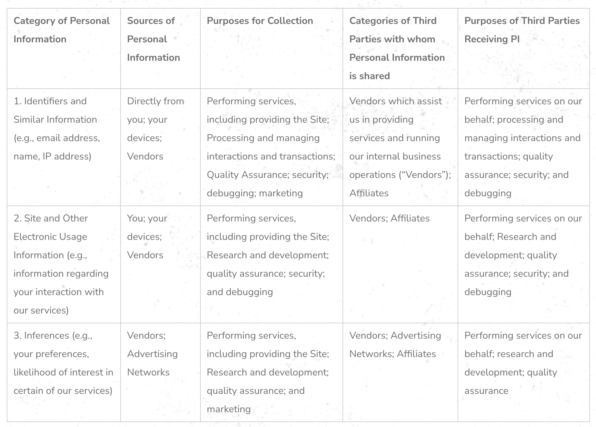 In the meantime, we are providing you with notice of the personal information we collect on the Site, and our purposes for that collection for data that may be subject to the CCPA (“CCPA Notice”). This CCPA Notice does not cover information that is outside of the scope of the CCPA. This CCPA Notice also does not apply to information collected from employees, applicants or contractors, or to information collected from individuals acting as representatives of another business in connection with business communications or transactions. See the “Applicant CCPA Pre-Collection Notice” below for information we collect about job applicants and the purposes for which we use it.